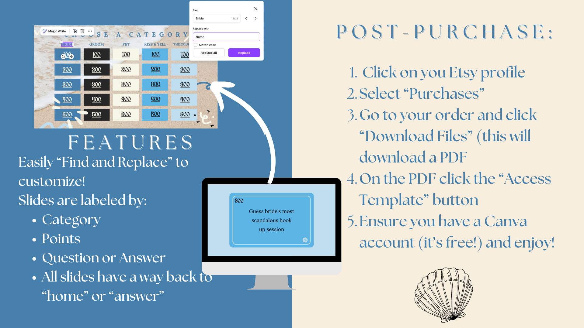 Plan an unforgettable bachelorette party with our "Bride's Last Toast on the Coast" Jeopardy game! This digital Canva template brings the charm of Montauk with its blue, shell, and old-money coastal vibes. Perfect for any maid of honor, bride, or bachelorette party planner looking to add a touch of elegance and fun to their event.