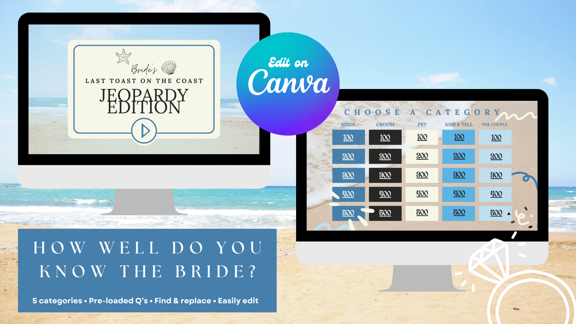 Bride's Last Toast on the Coast Jeopardy Game | Bachelorette Party Game | Coastal Theme | Canva Template | Montauk Vibes | 2025-2026
